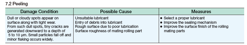 列入,轴承失效的一个原因是由于润滑太少或方法不当导致的挡边擦伤。如果该情况多次发生,需要对轴承运行环境等进行研究,然后采用正确的应对方法。